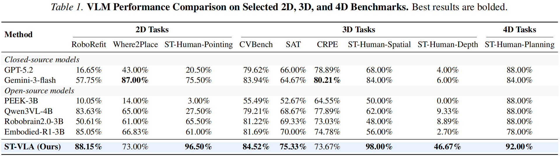 Table 1: VLM Performance Comparison on Selected 2D, 3D, and 4D Benchmarks. Best results are bolded.