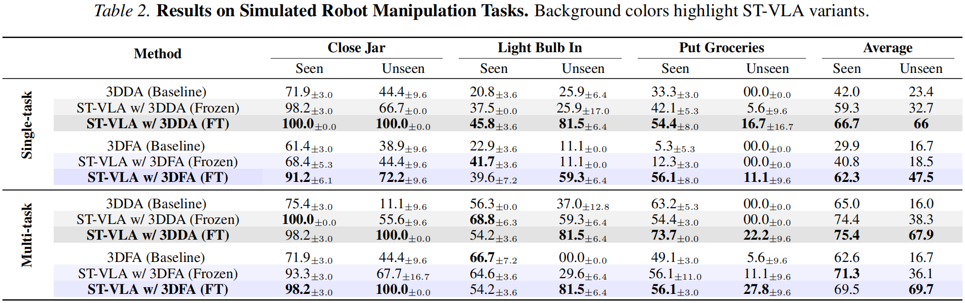 Table 2: Results on Simulated Robot Manipulation Tasks. Background colors highlight ST-VLA variants.