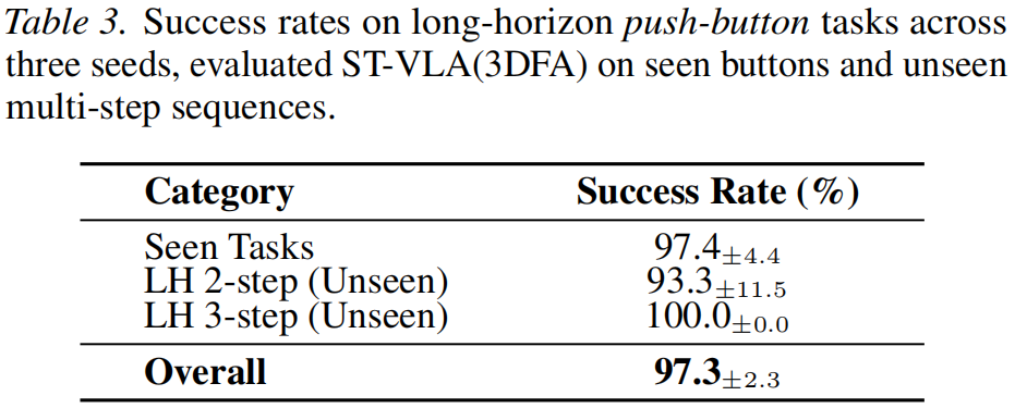 Table 3: Success rates on long-horizon push-button tasks across three seeds, evaluated ST-VLA(3DFA) on seen buttons and unseen multi-step sequences.
